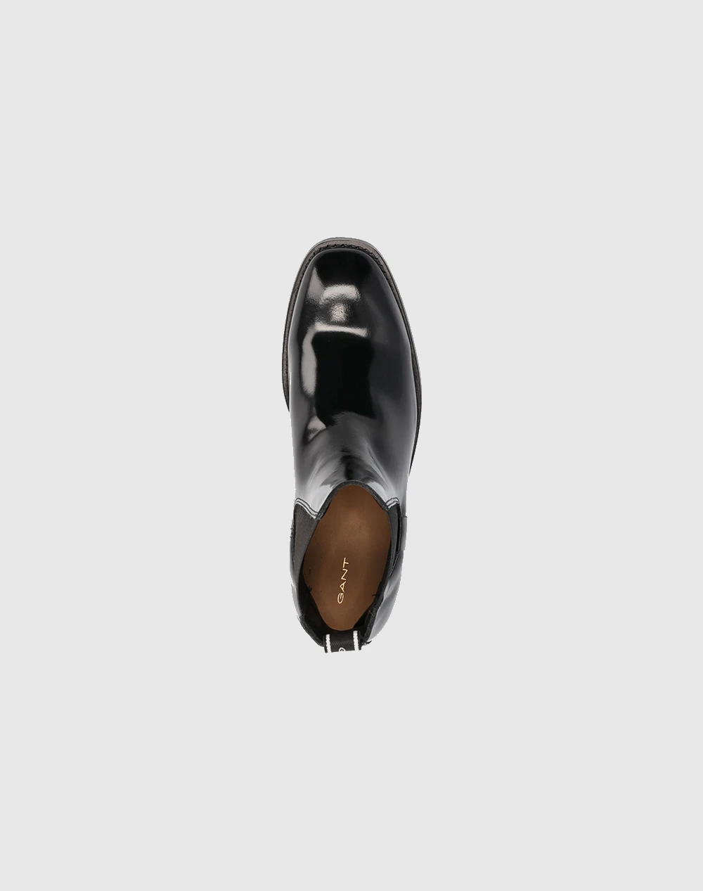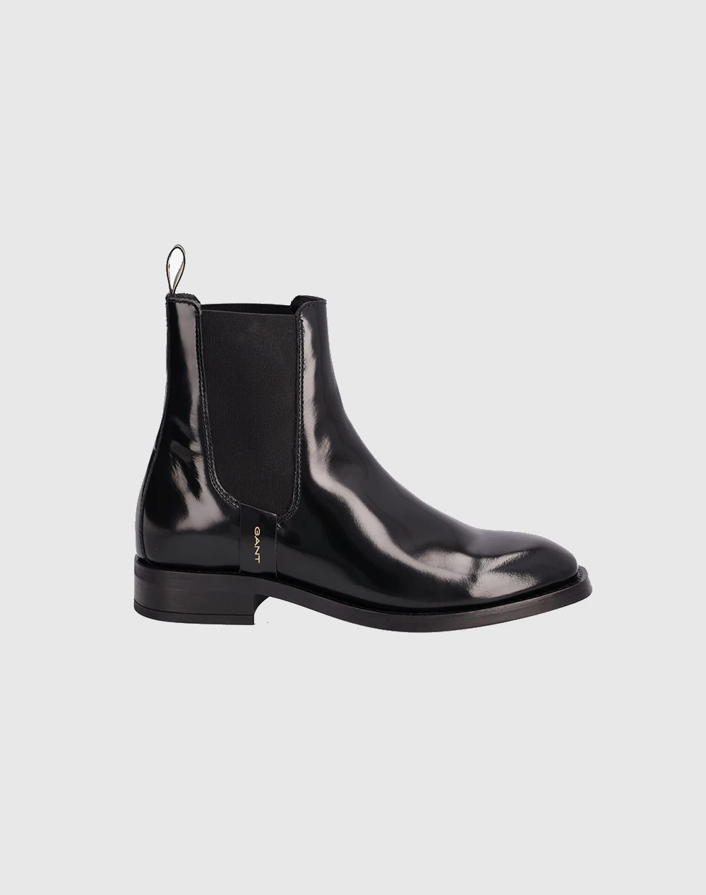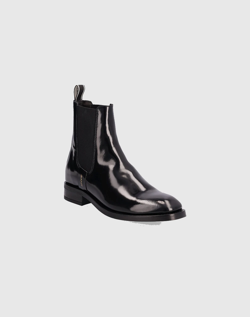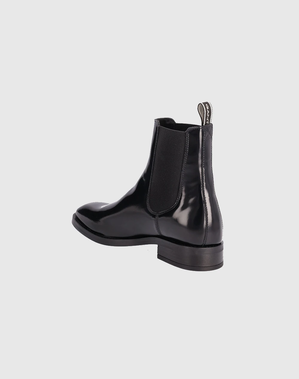 Γυναικεία μποτάκια μονόχρωμα, με διακοσμητικό λάστιχο στο πλάι, δερμάτινο τύπωμα το λογότυπο της εταιρείας και διακοσμητική θηλιά στο πάνω μέρος πίσω. ( Σύνθεση: 100% Δέρμα )